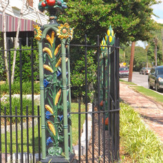 The Dufour Plassan House (1206 North White Street) was originally built in 1870 on Esplanade Avenue for the attorney Cyprien Dufour. The house was moved to its current location in 1906 and purchased by Adolph Plassan. The Dufour Plassan House only has the pumpkin and cornstalk fence posts from the Wood & Perot’s 1858 pattern, but the house also features fence posts with sunflowers, ears of corn, and cornucopias that were also made by Wood, Miltenberger, & Co. The house’s front stained-glass windows also feature cornstalks.