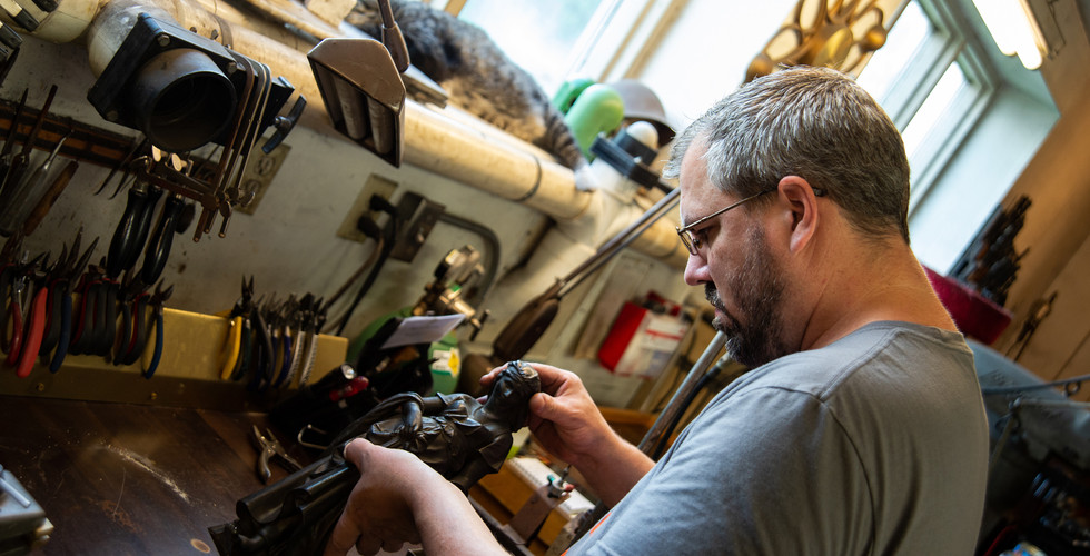 When these steps are completed, Kevin transitions to a mini torch which allows for precise, smaller adjustments. After all of the pieces are connected and all imperfections are filled, the flux must be neutralized. Without neutralization the flux’s acidity will deteriorate the piece over time. A mixture of baking soda and water is all that is needed. To cover the bright silver color of the welds, a black patina is applied to darken the surface of the metal. Acrylic paint is mixed to match the brass plating and applied with a detail brush. Once a wax coating seals the paint, the statue is complete and ready for pickup by the client.