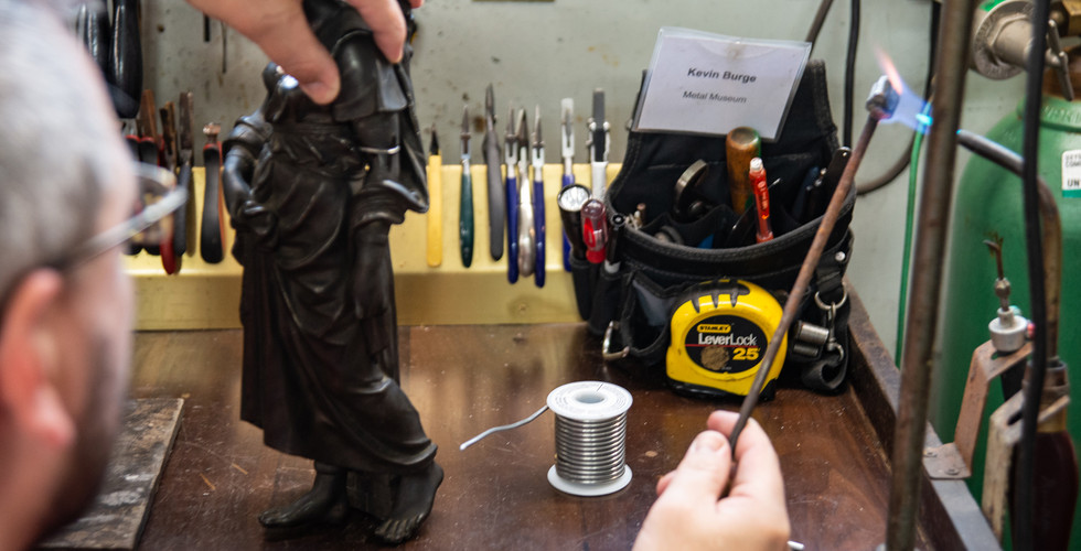 Kevin Burge, our Repair & Restoration Specialist, has worked at the Metal Museum for nearly a decade. He received his BFA in jewelry and metalsmithing from Missouri State University in 2007. Soon after, he began his position at the Metal Museum and his skills have grown to include everything from repair work to mount making, exhibit installation, and more. This is a full-time endeavor, as the Museum takes on repair and restoration projects year-round. Our shop receives close to 300 repairs each year. This doesn’t include the number of repairs during our largest fundraiser, Repair Days. Over the course of the Repair Days weekend, over a hundred volunteers complete between 100 and 150 repairs. Any remaining projects are handled personally by Kevin.