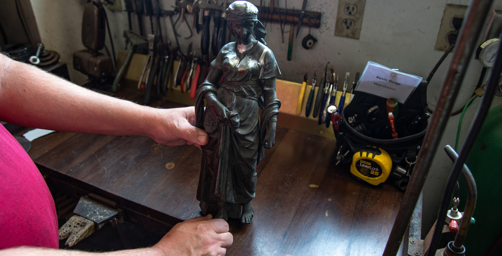 Kevin’s latest repair project is a statue of a female figure with the head folded into its chest. “Figuring out how they put it together [and] what the material is” are the first steps on the road to a successful repair. This particular statue was crafted from brass-plated pot metal. Because this is a soft metal, similar to pewter, the statue can be bent back into place and soldered fairly easily. Kevin used a vice grip to pull the head back into its proper position with minor difficulty. In order to reach the figure’s caved-in chest, Kevin cut a section from the elbow to the shoulder with a small hand saw. Hand-made tools, including a manipulated steel bar, give him much needed leverage to fix imperfections. Trial and error are a large part of this process. With several tools at his disposal, Kevin uses a variety of techniques in his daily work.