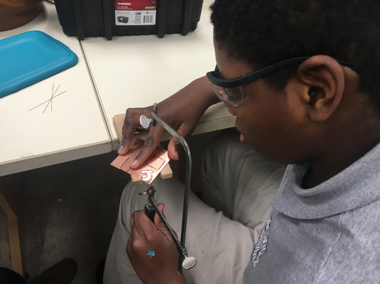 Each week, the newer students were introduced to a new metalworking technique, including sawing, filing, drilling, texturing, and enameling. This is where they learned the basics and linked these processes together to create their own original pieces. This initial training period is also where students discover which techniques they enjoy the most. Some students love enameling because of its painterly, colorful effects while others flourish making antiqued copper pendants from interesting shapes. Their enthusiasm and affinity for new skills is always a treat. Tyshun, a first year student, made sawing through copper look easy and learned how to rivet more quickly than some college students I know.